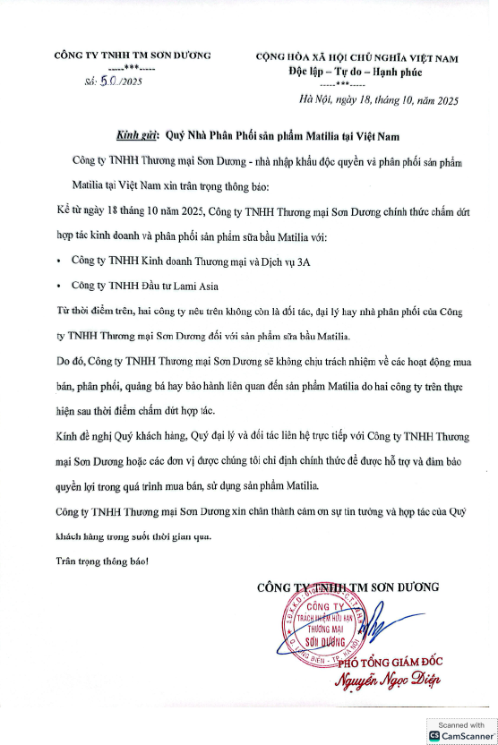 THÔNG BÁO CHÍNH THỨC VỀ VIỆC CHẤM DỨT HỢP TÁC KINH DOANH VÀ PHÂN PHỐI SẢN PHẨM SỮA BẦU MATILIA