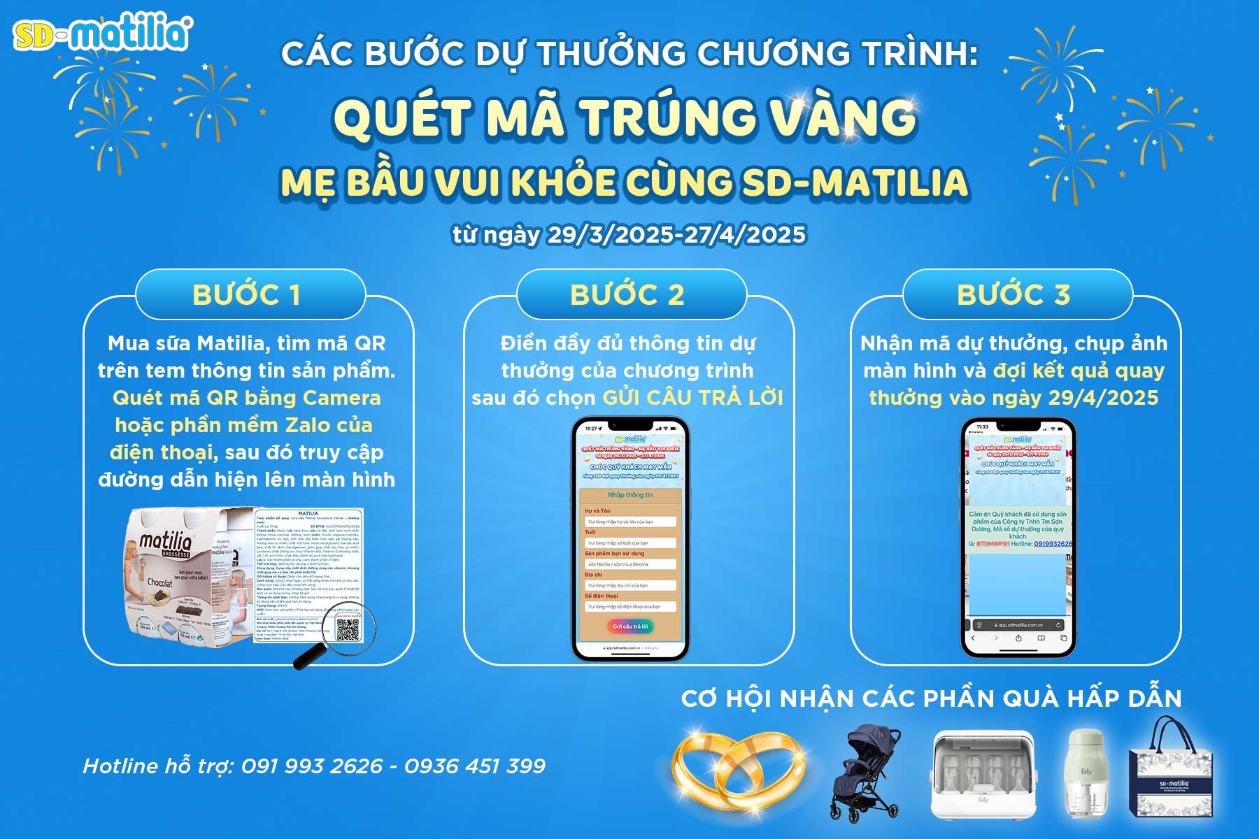 tri ân khách hàng đã tin tưởng và đồng hành cùng thương hiệu Matilia, Công ty TNHH Thương mại Sơn Dương - nhà phân phối độc quyền sữa bầu Matilia của Pháp tại Việt Nam - chính thức triển khai chương trình khuyến mại "Quét mã trúng vàng - Mẹ bầu vui khỏe". Đặc biệt, giải thưởng cao nhất là nhẫn vàng 9999, biểu tượng của may mắn và tài lộc, dành tặng các mẹ bầu may mắn nhất.